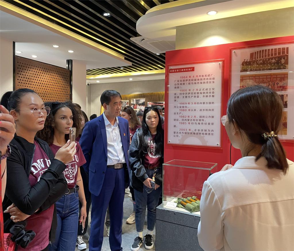 28日下午,活动团来到了乌海市阳光田宇国际酒庄。阳光田宇国际酒庄位于乌海市海南区巴音陶亥镇赛汗乌素村北的赛汗乌素生态园。阳光田宇国际酒庄作为民族企业,以生态文明为先,弘扬黄河文化为发展理念,采取村企联动的模式,积极参与到脱贫攻坚中,带动当地农区居民脱贫致富。留学生们在工作人员的带领下,深入葡萄酒窖进行参观,聆听企业介绍,品尝精酿葡萄酒。通过参观学生们对民族企业文化有了更深刻的了解,赞叹中国脱贫攻坚成就,敬佩脱贫攻坚精神。