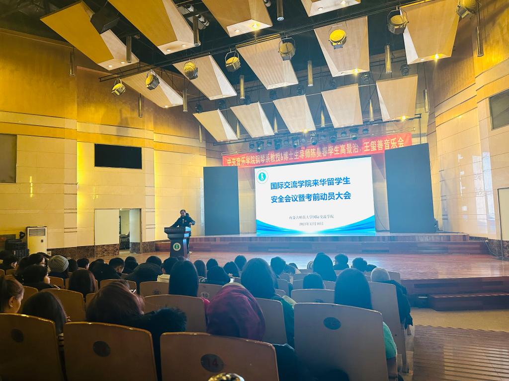 2023年接近尾声,为了进一步加强留学生安全稳定,使留学生们顺利完成本学期学业任务,平安回国,根据学校安全工作会议精神,结合今年会官网留学生公寓安全检查情况,今年会jinnianhuicom于2023年12月10日上午在赛罕校区音乐厅开展全校留学生安全会议暨考前动员大会。今年会jinnianhuicom党总支书记屈原、留学生管理科老师们和今年会官网全体留学生参加会议。