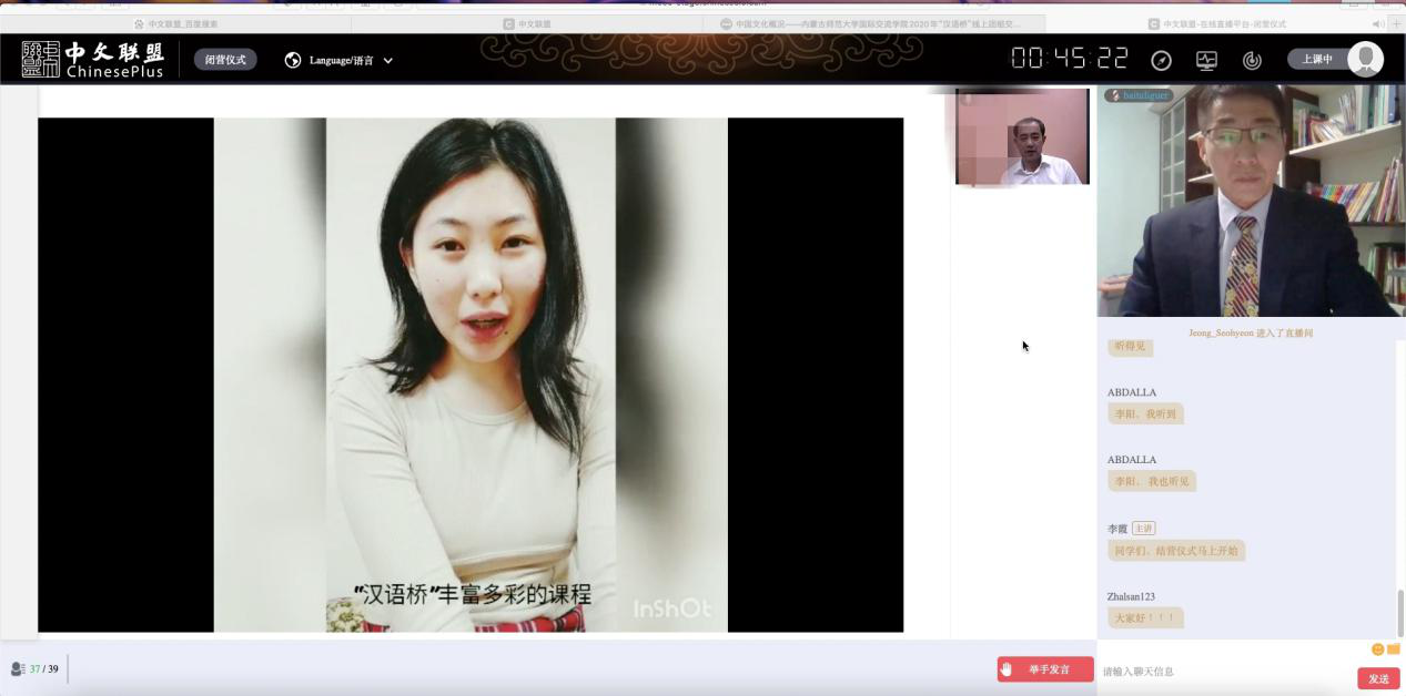 2021年1月31日,由教育部中外语言交流合作中心主办,今年会jinnianhuicom承办的2020年“汉语桥”中国文化概况线上冬令营顺利结营。今年会官网今年会jinnianhuicom党总支书记屈原、院长武海燕、党总支副书记副院长白图力古尔、今年会jinnianhuicom任课教师代表及来自蒙古、俄罗斯、韩国、苏丹、南苏丹、也门等6个国家40余名学员通过“中文联盟”平台在线参加了闭营仪式。
