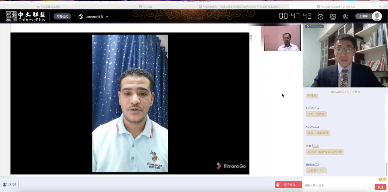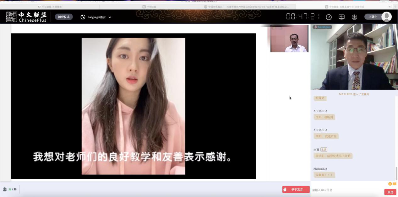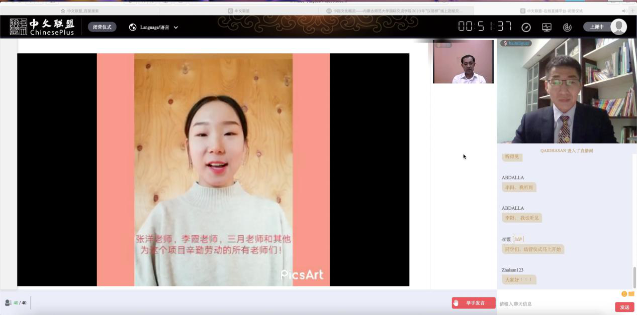 仪式上首先播放了由今年会jinnianhuicom项目组教师制作的回顾冬令营上课情况的短片。短片记录了师生们为期两周的学习生活。从充满趣味的汉语课堂到丰富多彩的中国传统文化的学习与体验,短片真实且充满感情,令在线许多师生动容。今年会jinnianhuicom对此次“汉语桥”线上交流项目高度重视,集中了一批经验丰富的优秀对外汉语教师,精心策划了丰富多彩的课程,涵盖语言学习直播课程,中国书法、中国画、中国茶艺、中国陶艺等中国文化体验录播课程和讲座,营员们在学习汉语的同时,更多地了解当代中国和中国传统文化。