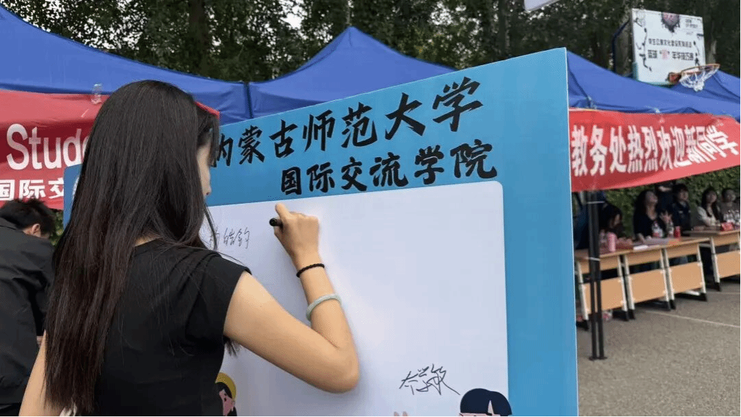 学院设计的留言板,吸引新生和家长的目光。热情的学长学姐指引着各位新生在留言板上留言打卡,同时也留下了各位新生在今年会jinnianhuicom的第一张照片。