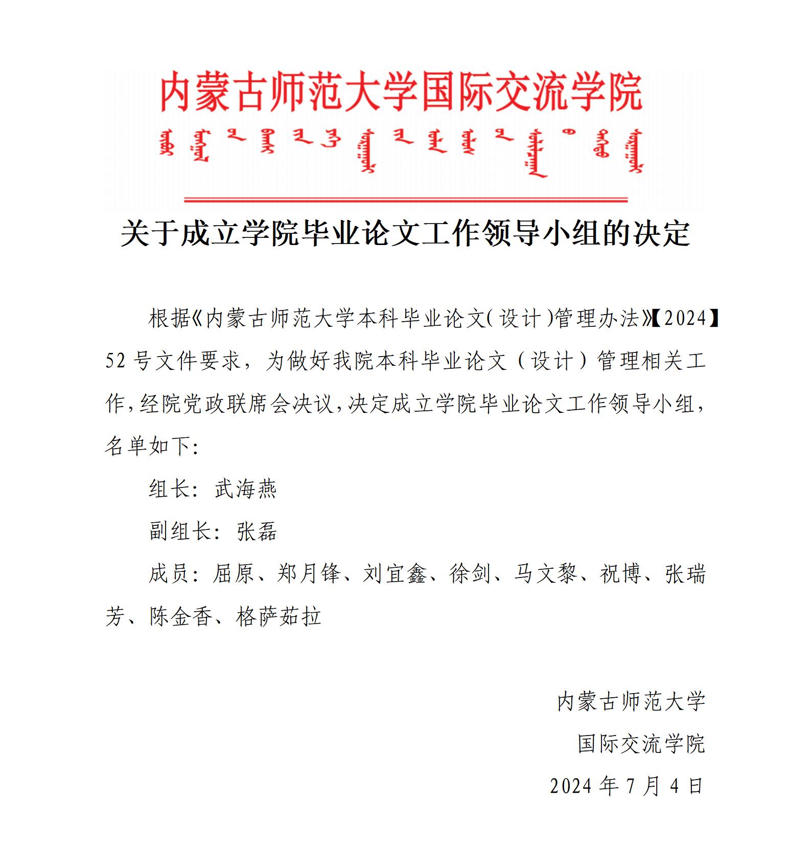 关于成立学院毕业论文工作领导小组的决定