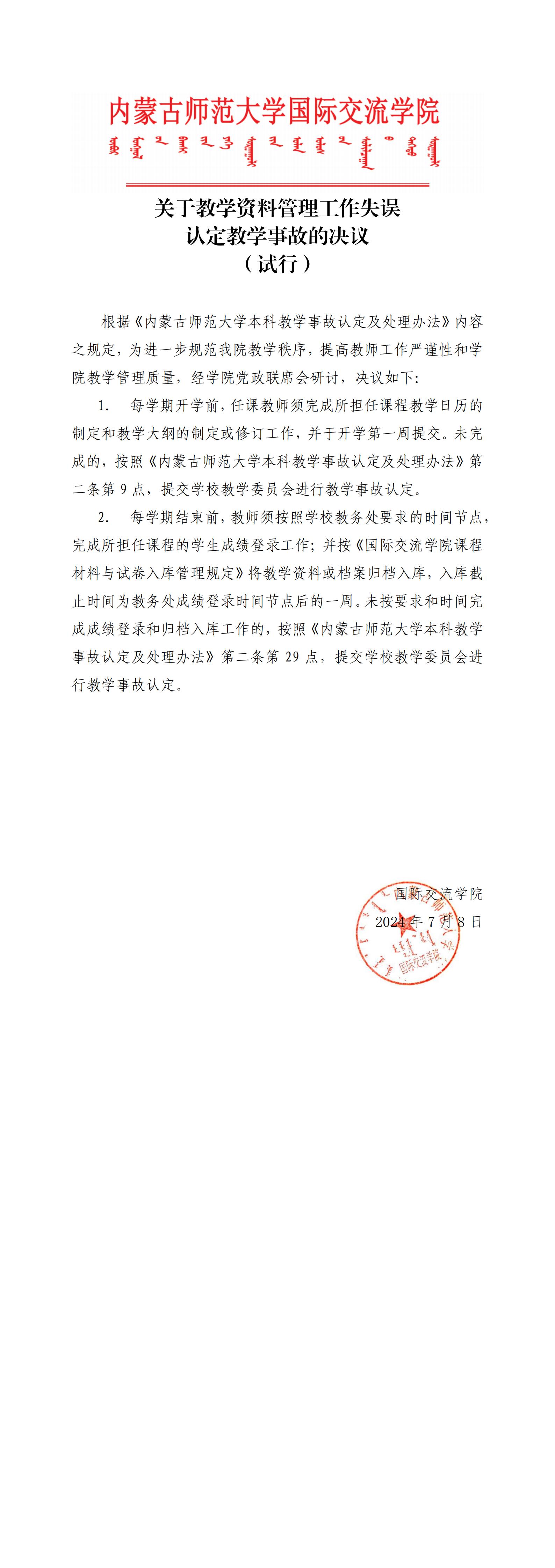 关于教学资料管理工作失误认定教学事故的决议(试行)