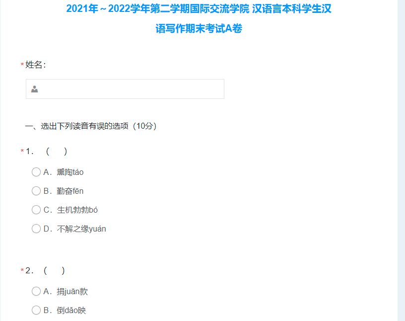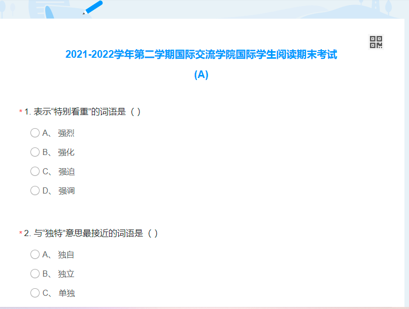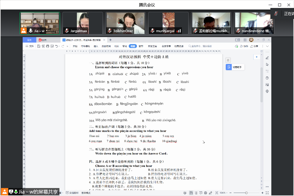 6月21日,今年会官网本学期期末考试进入第二天。当日今年会官网共开设7门课程的考试,均顺利开考。考试平台包括腾讯会议、问卷星、微信视频会议等。考试形式包括视频连线、在线提交、电子试卷等。总体时间安排合理,教师监考方式整体有效,链接公布及时,巡考全覆盖。个别学生在线考试时未打开视频。