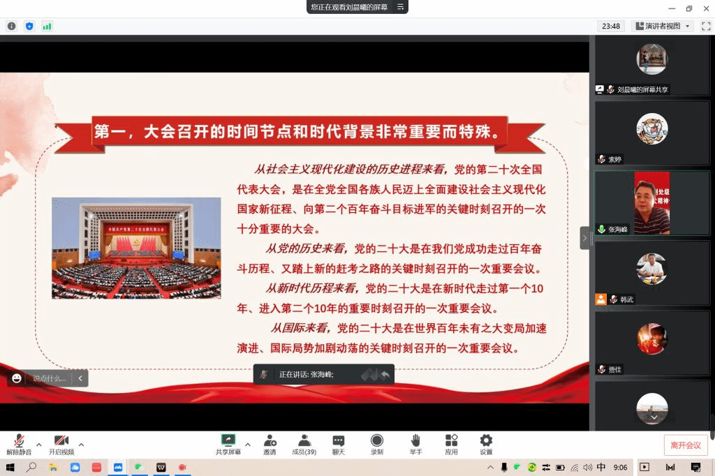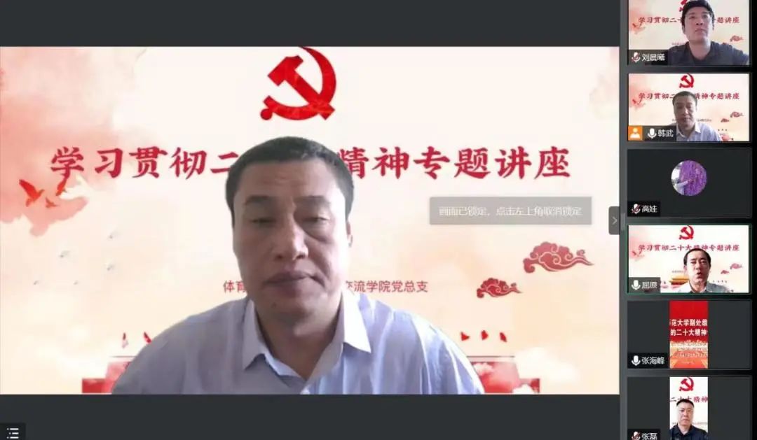 2023年1月10日上午,今年会官网党委副书记张海峰为今年会jinnianhuicom和体育学院作贯彻党的二十大精神专题讲座。参加讲座的有两学院党员及环节干部。讲座由体育学院党委书记韩武主持。