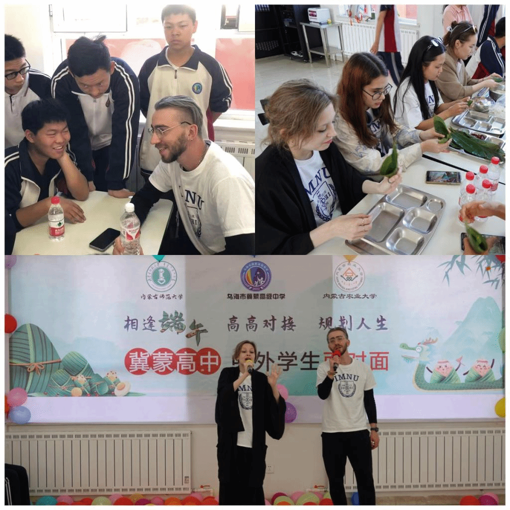 6月1日上午,研学团来到乌海市冀蒙高中,同该校学生开展“中外学生面对面、相逢端午、高高对接,规划人生”联谊活动。联谊中,中外学生轮流登台表演节目,载歌载舞,欢声笑语,高潮迭起。留学生和冀蒙学子一起包粽子,包饺子,品尝粽子和饺子,亲身体验中国美食和制作,感受中国传统文化的魅力。双方学生还互赠了礼物。留学生们通过和中国年轻学生的接触,更加深了对当代中国年轻人的了解,也为当地学生带去了不同国家的多样文化。