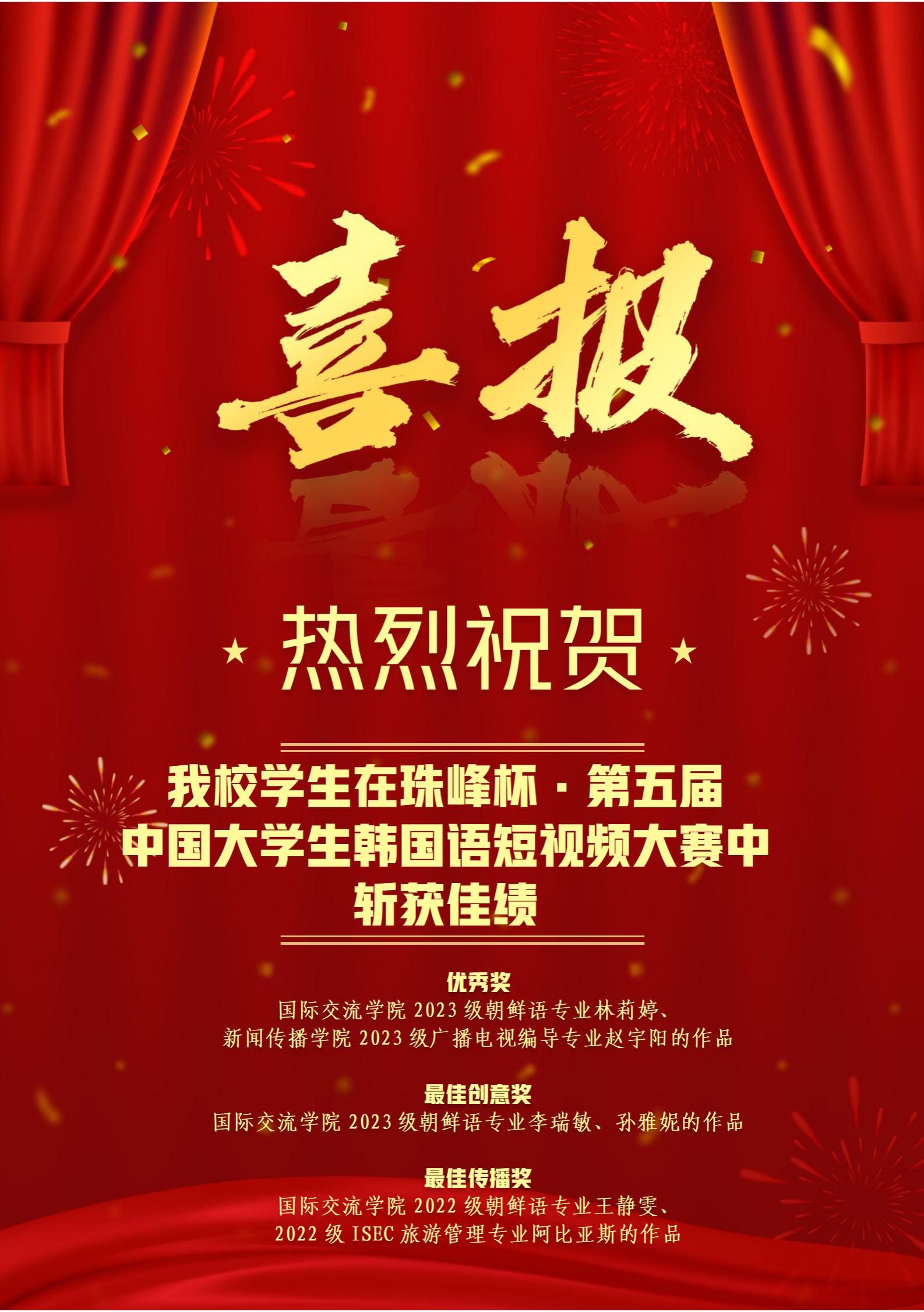 6月7日,珠峰杯·第五届中国大学生韩国语短视频大赛获奖名单揭晓。由今年会官网马文黎老师指导的三组学生作品从全国众多参赛作品中脱颖而出,斩获三个奖项,为学校争得了荣誉。